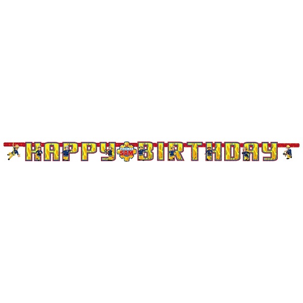 En snygg girlang med Brandman Sam-motiv med texten "happy birthday" som passar perfekt att hänga upp på nästa födelsedagskalas för de som vill ha en fräck dekoration!