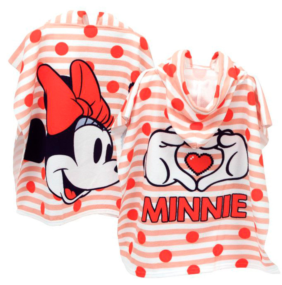 En fin, skön och praktisk badponcho som gör torkningen enklare och förhindrar det från att bli kallt. Trä på ponchon över huvudet och problemet är löst! I denna utgåva har du ett sött rosa randigt mönster och röd prickar med Mimmi Pigg.