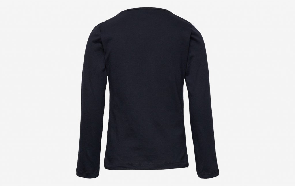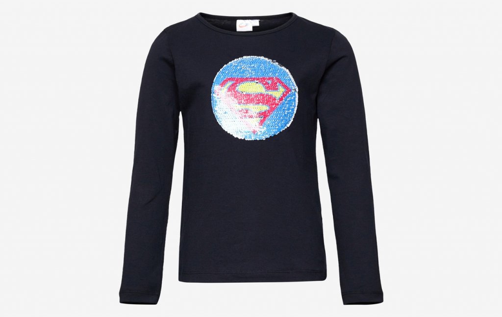 Nu är den här en långärmad T-shirt med motiv på Supergilrs märke och Wonder Womans märke som kan ändras mellan dem genom att vända paljetterna upp eller ner som utgör märkena.