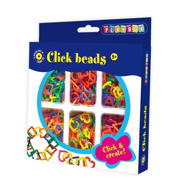 Pärlor av plast där du "klickar" ihop pärlorna för att skapa t.ex. armband. Ca 300st 20x20x2,5mm pärlor i 7 olika färger och 5 olika motiv. Naturligtvis testade och godkända enligt EN71.