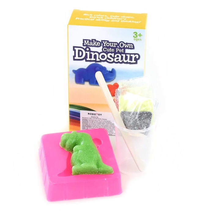 DIY kit - skapa din dinosauriefigur. Skapa din dinosaurie med detta enkla kit. Satsen innehåller en form, en förpackning med dinosauriepulver, en förpackning med glitter och allt du behöver för att göra blandningen.