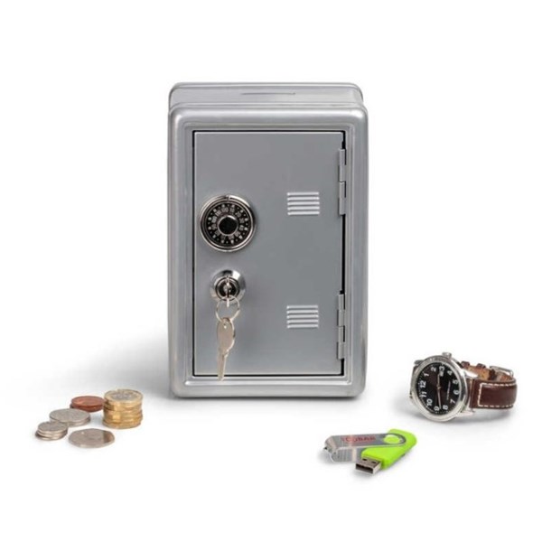 Håll koll på värdesakerna! Det här roliga kassaskåpet har både kodlås och nyckellås, och en snygg silvrig design. Det har även ett myntinkast med en behållare invändigt, så att du enkelt kan spara dina slantar. Metal Locker Bank är en skojig och välgjord leksak, som ser ut precis som ett riktigt kassaskåp! - Silverfärgad - Två låsmekanismer - Har myntinkast Produktinformation: Mått: 18 cm (höjd) Rekommenderad ålder: Från 5 år