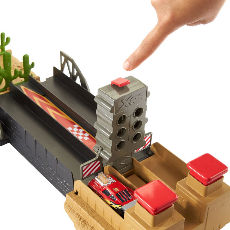 Ställ Bilarna på startplattformen och tryck på knappen efter klara, färdiga gå! Utmana en vän på racingbanan eller ha en stunttävling i rampen!