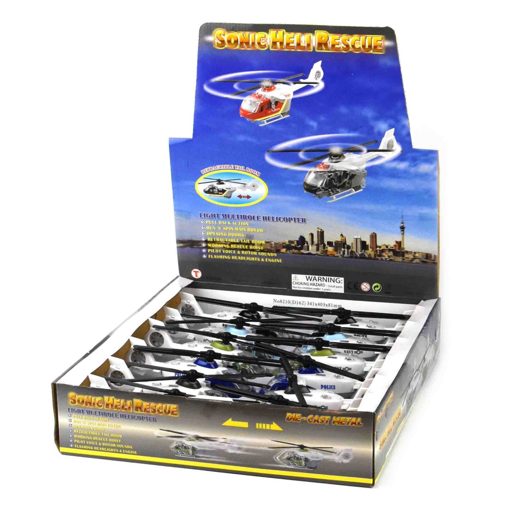 Cool helikopter med spännande finesser! Den erbjuder både ljus och ljud, vilket skapar en häftig lekupplevelse. Du kan exempelvis höra pilotens röst och se strålkastarna blinka. Helikoptern är gjord av hållbar diecast-metall och har öppningsbara dörrar. Den finns i 6 varianter med olika färger. - Finns i 6 varianter - Batterier medföljer Produktinformation: Mått: 23 cm