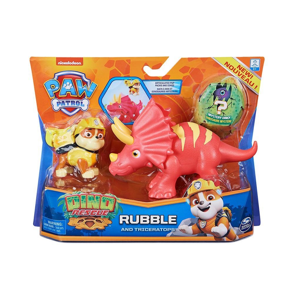Den ena dinosaurien är en triceratops som du ser på bilden och den andra är en mindre dinosaurie som befinner sig i det gröna överraskningsägget. När du drar upp svansen på triceratopsen så höjer den huvet för att skydda kroppen mot rovdjur. Rubble har en grävskopa på ryggen som kan vecklas ut.