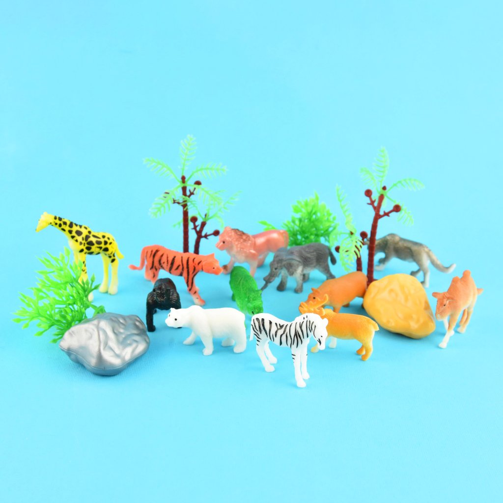 Med det här setet kan du skapa dina egna djuräventyr! Setet inkluderar giraff, zebra, tiger, gorilla och många fler spännande djurarter. Dessutom medföljer träd, buskar och stenar, vilket gör leken mer realistisk och underhållande. Djuren har fina färger och verklighetstrogen design. - Set med vilda djur och tillbehör - Totalt 18 delar Produktinformation: Mått: 20 x 5 cm Rekommenderad ålder: Från 3 år