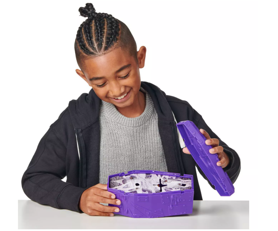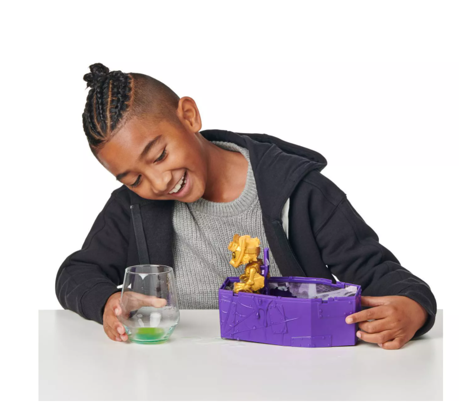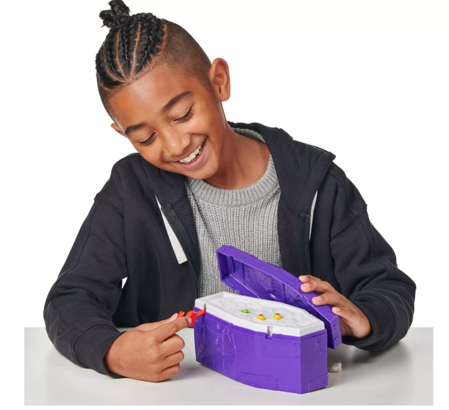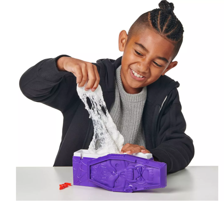 Blanda de hittade ingredienserna till ett bubblande slemmigt elixir. Häll den i kistan och se när ditt monster ger dig en överraskning och vaknar till liv! Fortsätt din kusliga jakt på skatten genom att öppna monstrets huvud. Vilka Glow-in-the-Dark-skatter hittar du inuti? Kommer det att bli en gulddippad Spindel?