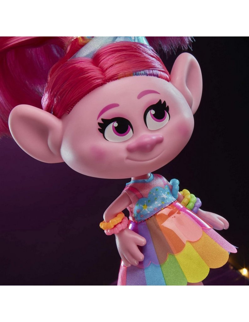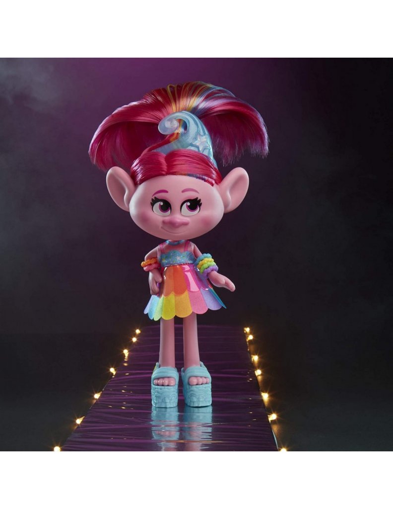 Alltid i stil, nu är Poppy mer vacker än någonsin med Glam Poppy Fashion docka. Med sitt rotade hår, färgglada avtagbara klänning, skor, 3 armband, örhänge och öron dubbar, hårtillbehör och borste, är Poppy Trolls dockan redo att visa upp sina moderna sanna färger!