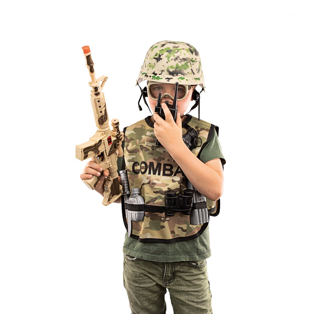 Soldat utklädnaden för barn som består av en kamouflagemönstrad väst där ammunition kan förvaras, en matchande hatt ingår också! Du får även alla tillbehör såsom glasögon, vapen, ammunition, walkie talkie, kikare och massa annat kul för realistisk lek!