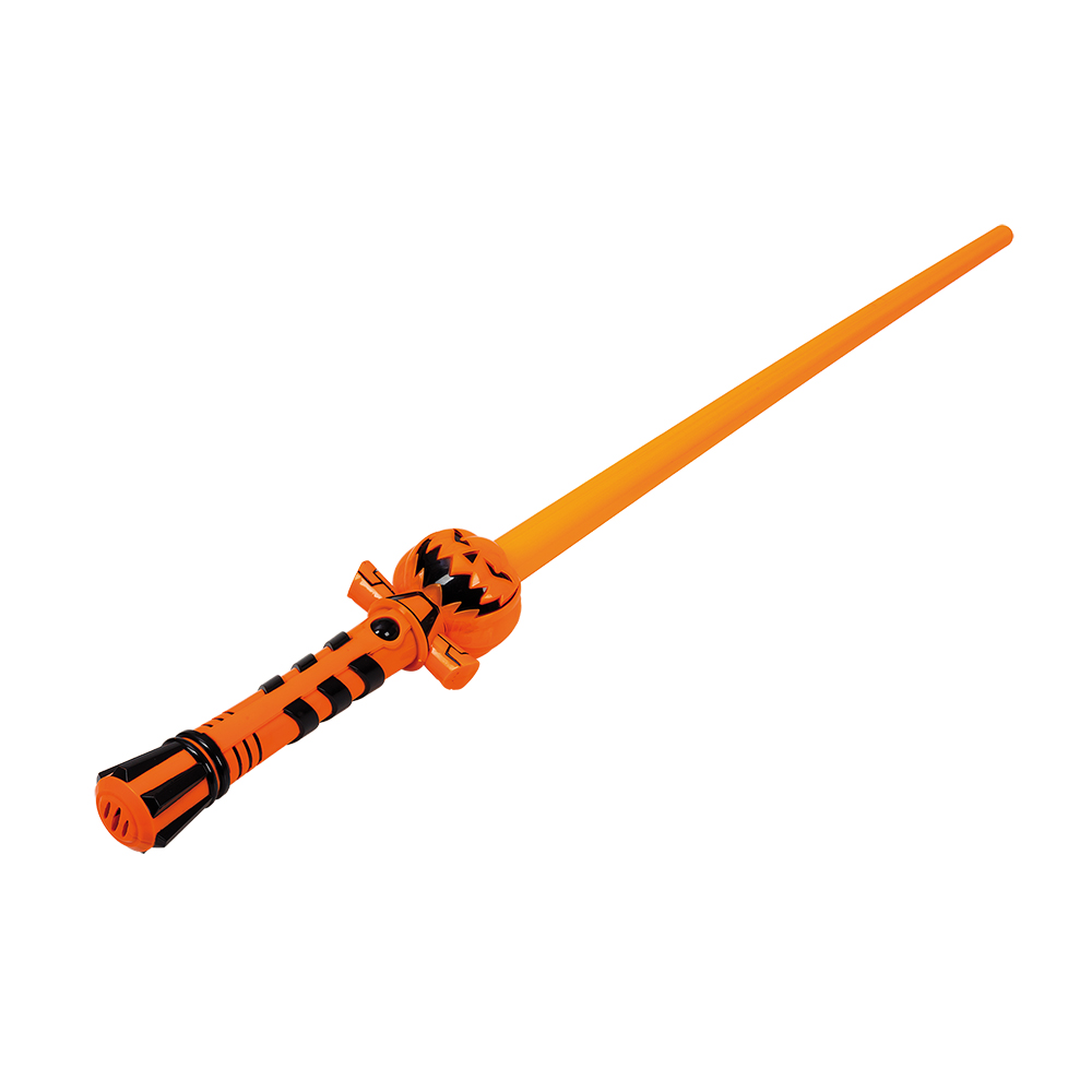 Halloween svärd med coola ljud- och ljuseffekter! Ett lysande svärd med motiv på pumpor. Leksaksvärdet ser ut som ett lasersvärd och lyser upp med ett knapptryck samtidigt som den ger ut ett coolt laserliknande ljud. Barnen kan leka med svärdet på Halloweenfesten eller ta med den ut när de kör bus eller godis!