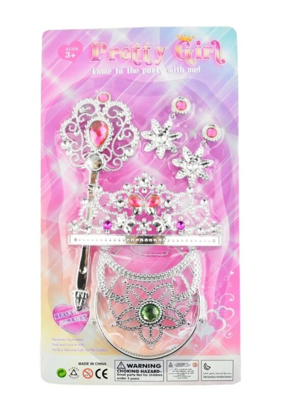 Det här setet har allt som en prinsessa behöver! Det innehåller totalt 5 delar med glittrig stil och snygg design. Du hittar exempelvis fina örhängen och skinande tiara. Kunglig stjärnglans i överflöd! Setet är perfekt för roliga lekar, samt för kalas och tillställningar. - Innehåller 5 delar Produktinformation: Mått: 35 cm Rekommenderad ålder: Från 3 år