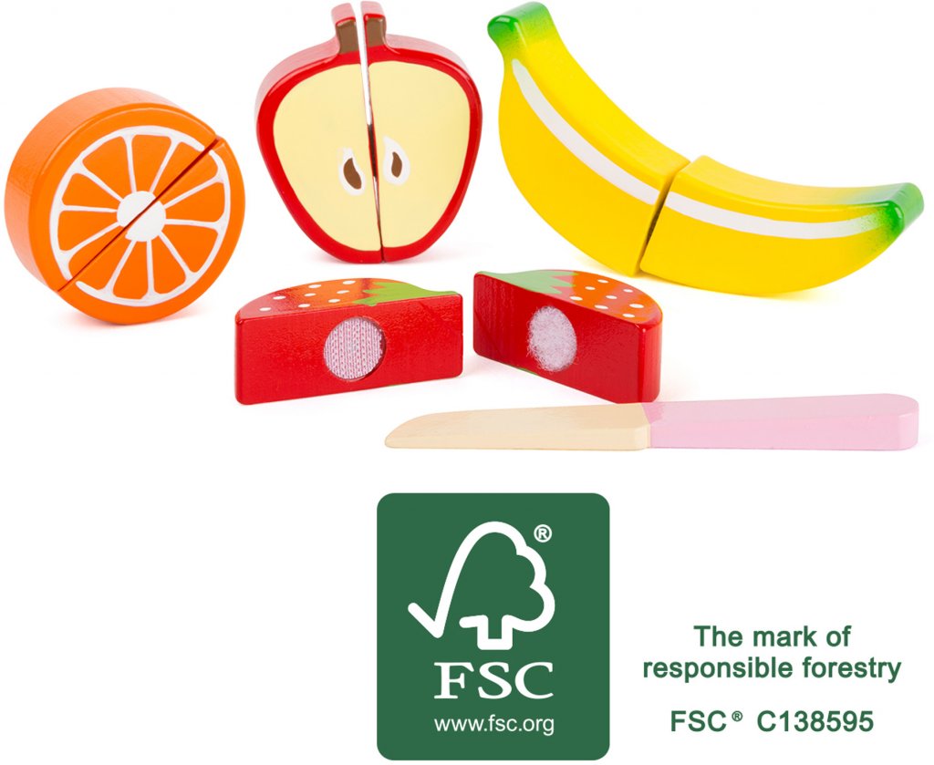 Delbar frukt i trä som enkelt kan sepereras med den medföljande träkniven. De robusta träbitarna hålls tillsammans med kardborreband. Denna produkt är tillverkad av FSC® 100% -certifierat trä.