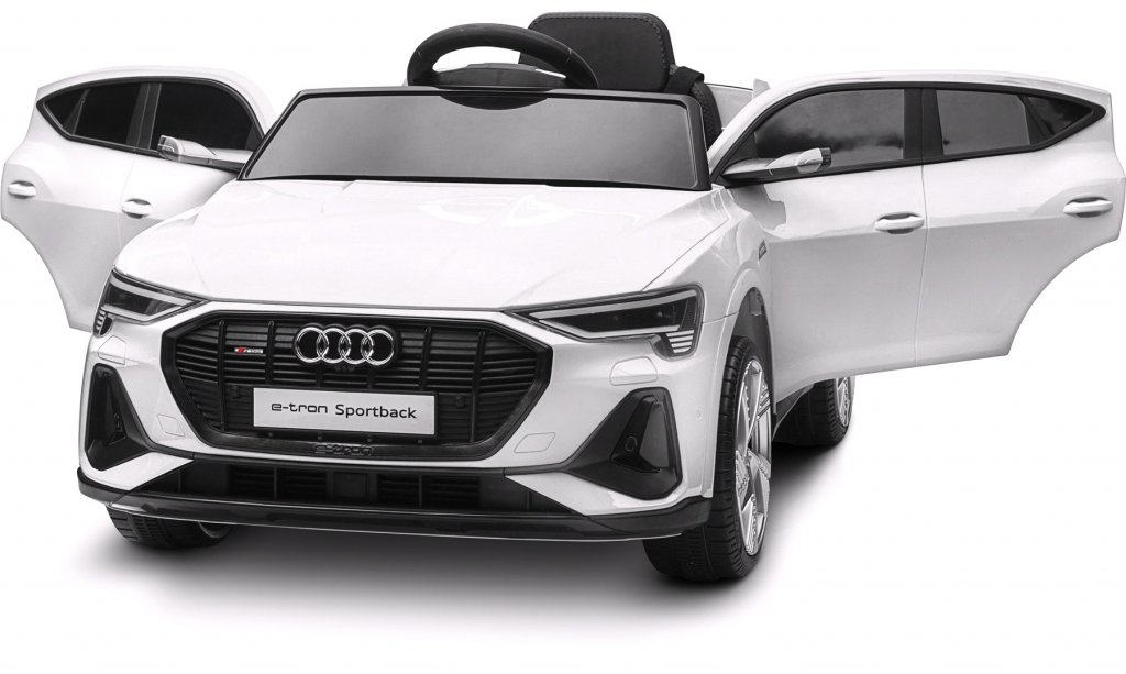 Fräck och cool elbil Audi E Tron med vit snygg design. Styr bilen med fjärrkontroll, barnet kan sitta i bilen medans vuxen styr bilen. Elbilen har exklusiva gummidäck för tystare och mjukare körning samt ljud och ljusfunktioner, glöm inte sätta på ljusen på kvällen. Bilen har även sidospeglar samt öppningsbara dörrar.