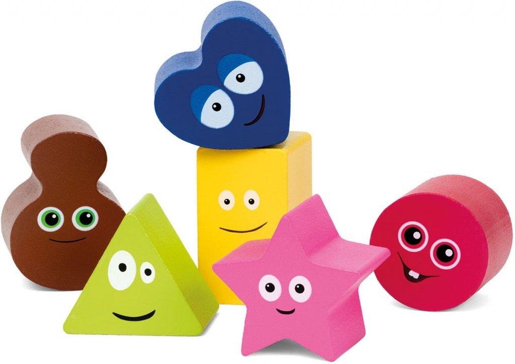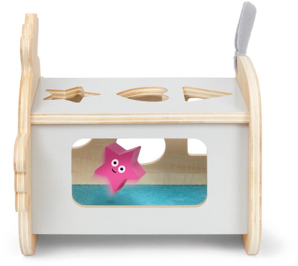 Öva din finmotorik genom att passa rätt kloss genom de olikformade öppningarna i lådans ovansida. Lådans botten är klädd i filt för att dämpa ljudet när klossarna faller genom.