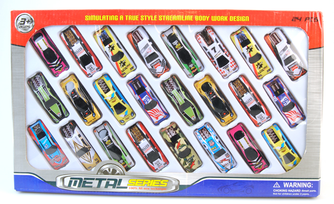 Fina fräcka metall bilar i en förpackning som enkelt kan ges som gåva eller till sig själv. I förpackningen finns 24 st bilar som du och kompisarna kan leka med i flera timmar.