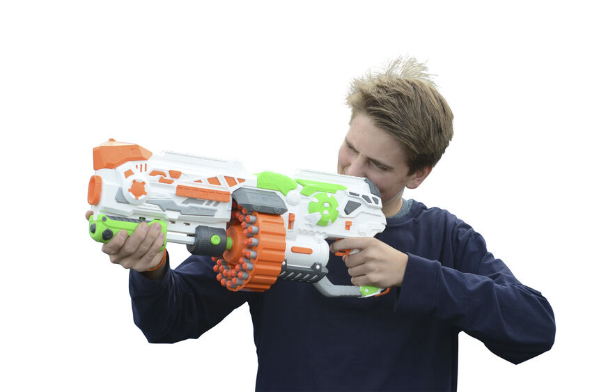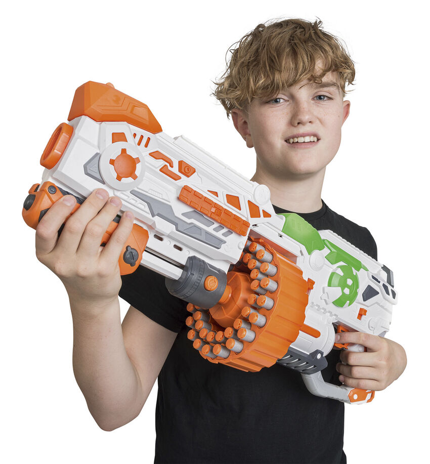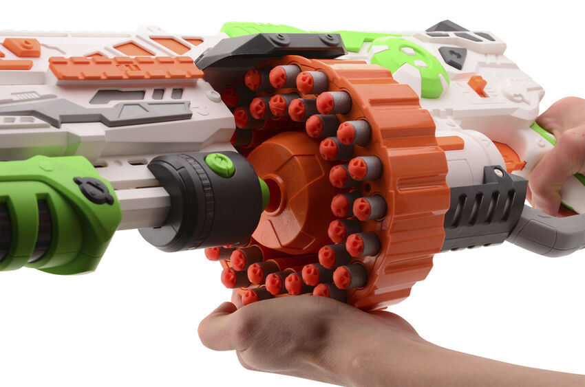• Roterande Jättetrumma: Rymmer 40 skumpilar för intensiv och långvarig action.