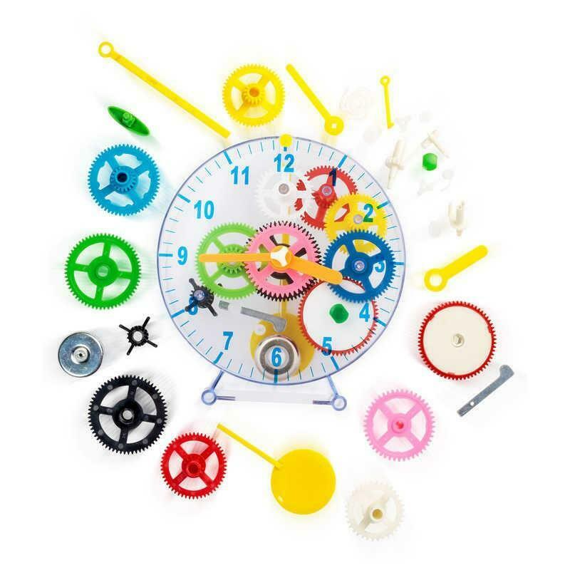 Den här färgstarka klockan fungerar mekaniskt med hjälp av fjädrar och kugghjul. Du kan lära dig hur klockor fungerar, hur kugghjul arbetar och hur en pendel håller takten genom att montera klocjan själv.