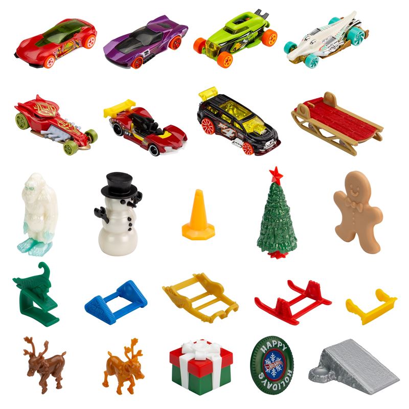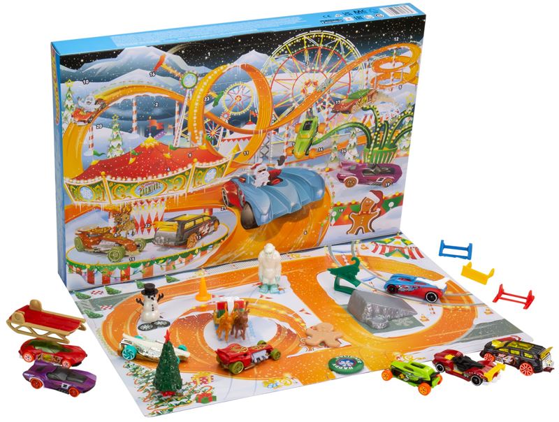 Öppna en lucka varje dag fram till julen. varje lucka gömmer en överraskning från Hot Wheels allt från populära Hot Wheels bilar till coola tillbehör! När alla luckor är öppna kan kalenders framsida vikas ut och avslöjar en gömd bilbana att köra runt på med dina nya leksaker.