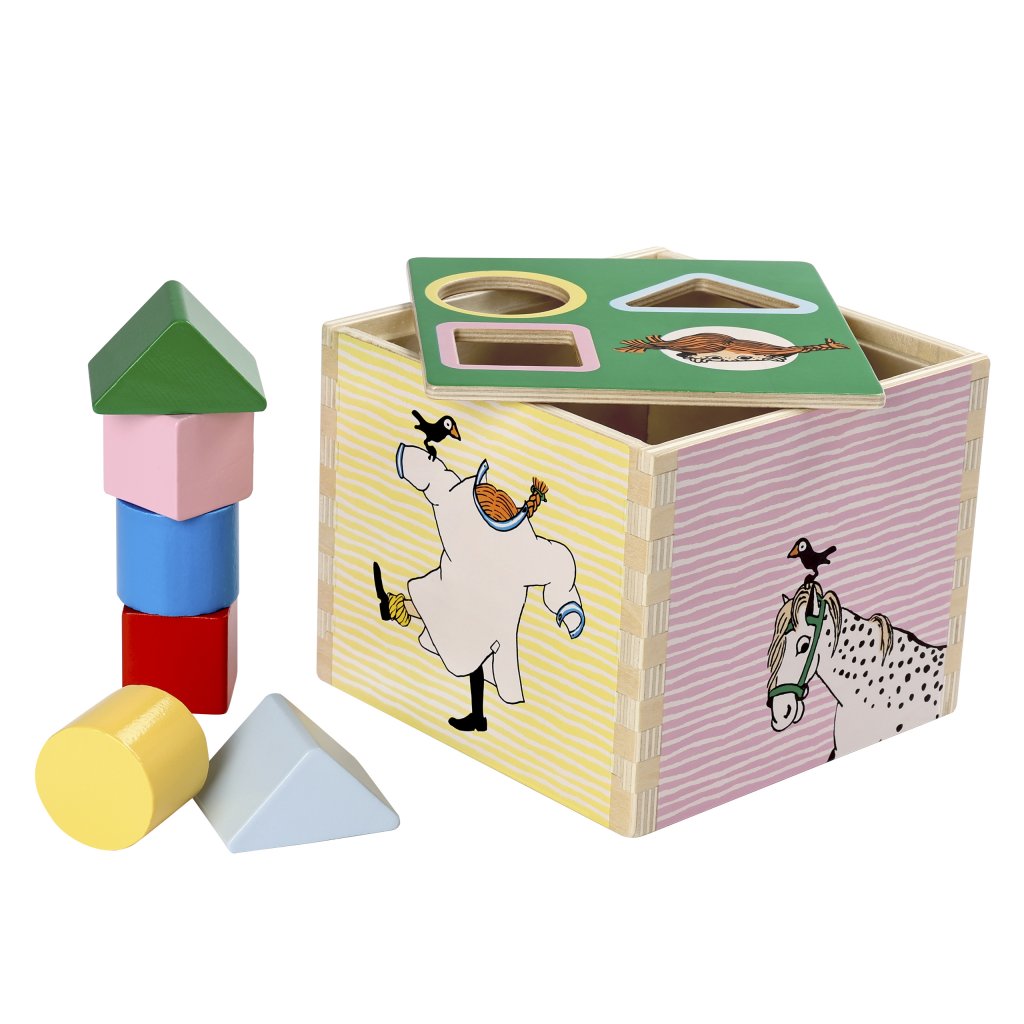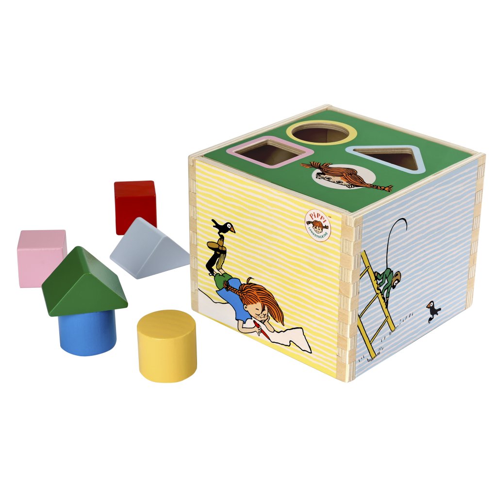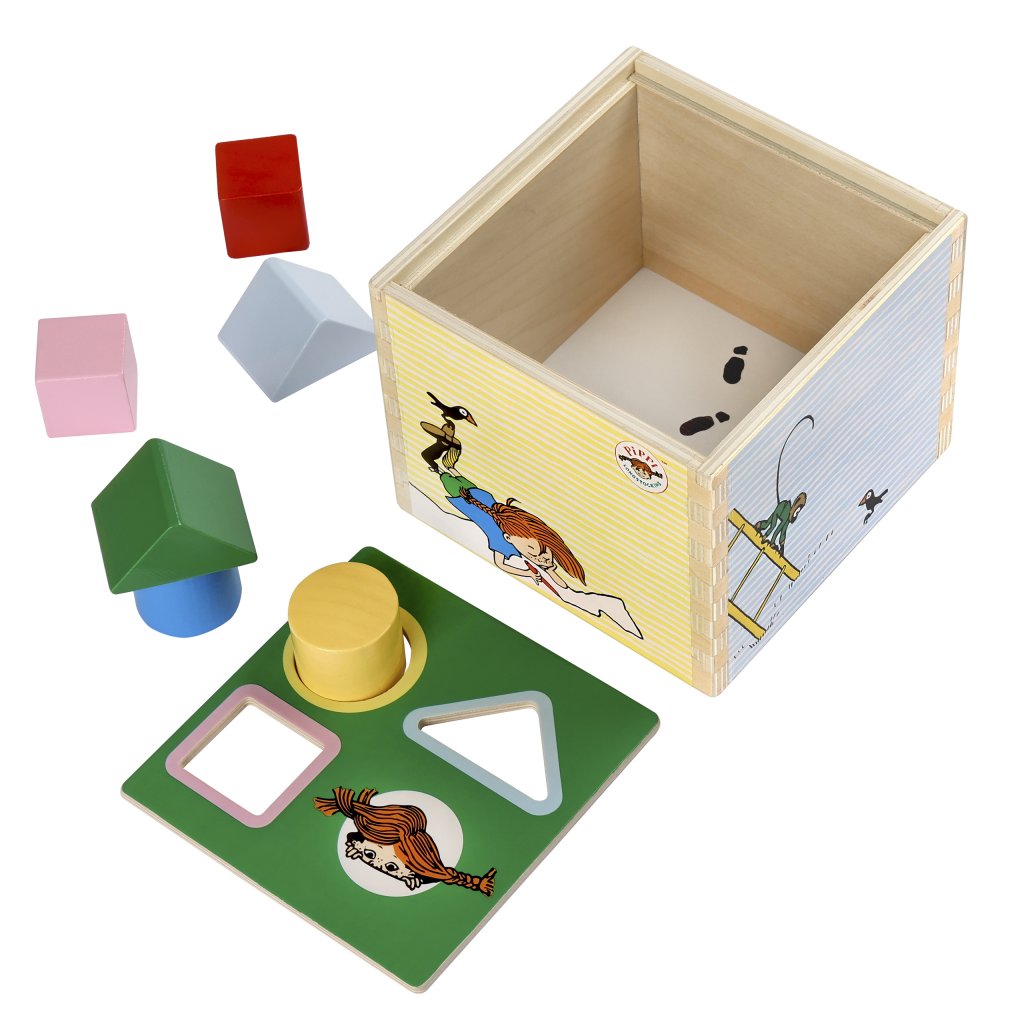 Pippi plocklåda i trä med sex klossar i olika former och färger som låter barnet utforska form och färg genom lek. Det avtagbara locket gör det enkelt att plocka i och ur klossarna, och Pippi kikar fram på locket för extra lekglädje. En rolig och pedagogisk leksak för de yngsta, omsorgsfullt utvecklad i Sverige av Micki.